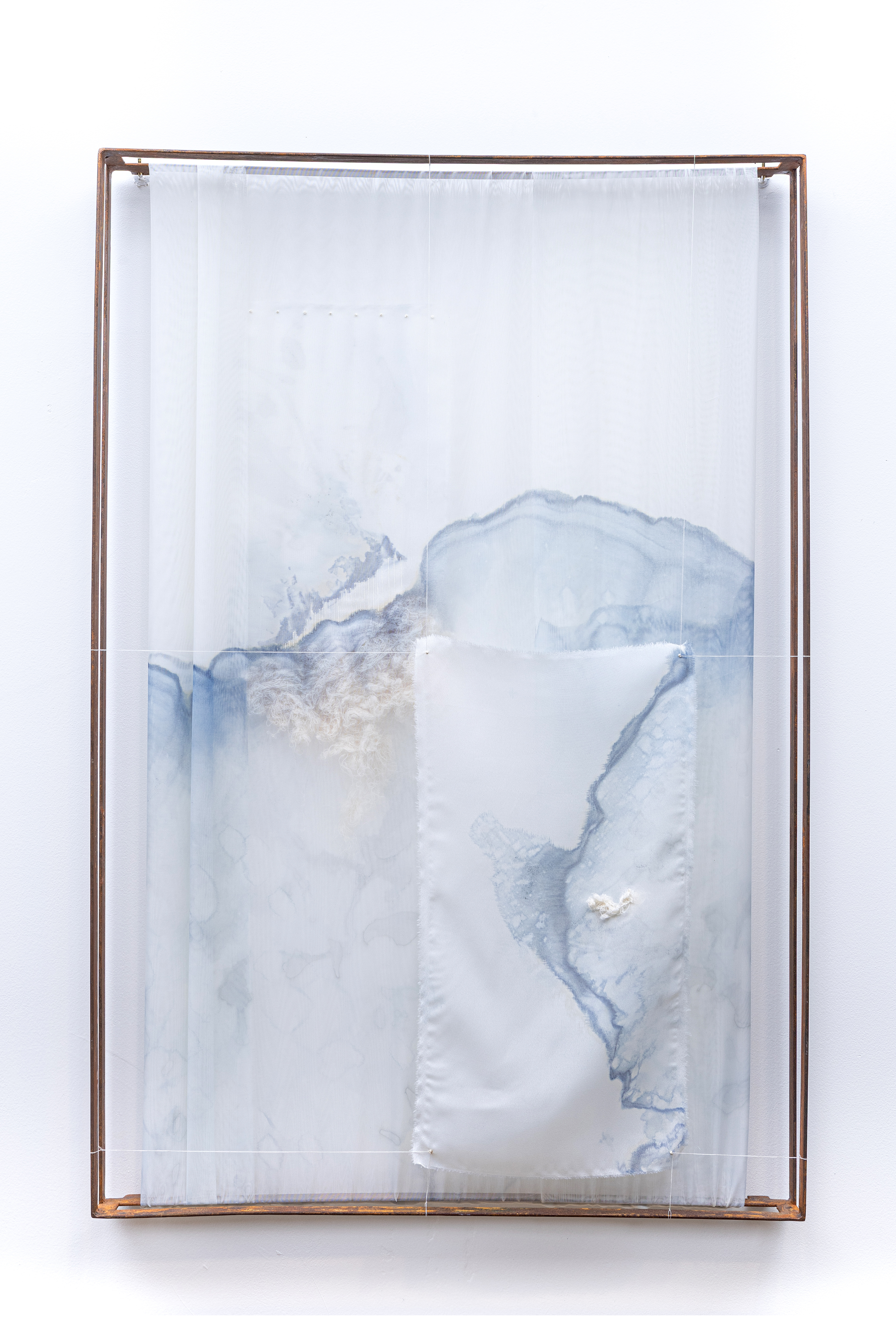 Se na obra de Camila os fragmentos de rocha, ao remontarem à brita, alegorizam a ação humana na construção do espaço, na obra de Amanda Mei as formas rochosas parecem ser dotadas de uma agência cósmica. Com uma prática na qual predominam as investigações nos campos da pintura e da instalação, Mei desenvolveu uma poética visual inconfundível, marcada pela predominância de tons azulados e pela construção de imagens que poderiam fazer referência ao nosso planeta ou a algum outro corpo celeste. A referida agência cósmica fica patente nos enigmáticos Meteoros da artista, esculturas confeccionadas em papelão, pintadas em uma paleta que oscila entre o cinza e o azul e instaladas no espaço como se recém-caídas do céu. A pintura Luna, representação circular de um corpo celeste, sugere uma integridade que as demais obras da artista friccionam: afinal, de onde se desprendem os Meteoros? Juntas, as obras Luna e Meteoro embaralham nosso entendimento acerca das relações entre a parte e o todo através de um salto para a escala cósmica e de uma aposta na entropia. Em relação a este último aspecto, destaca-se a série de pinturas Encontro marcado que, não apenas representa pictoricamente uma série de explosões mas o faz sobre um fundo de cor sólida, impressa digitalmente sobre o papel. À promessa de precisão cromática assegurada tecnologicamente, a artista sobrepõe a artesania da cor e a gestualidade explosiva da pintura. Um conjunto inédito de gravuras (relevo seco e colagem sobre papel) junta-se a esta seleção, projetando sobre a tradição da paisagem, outro campo caro à Mei, as problemáticas fronteiras que dividem as partes e o todo.