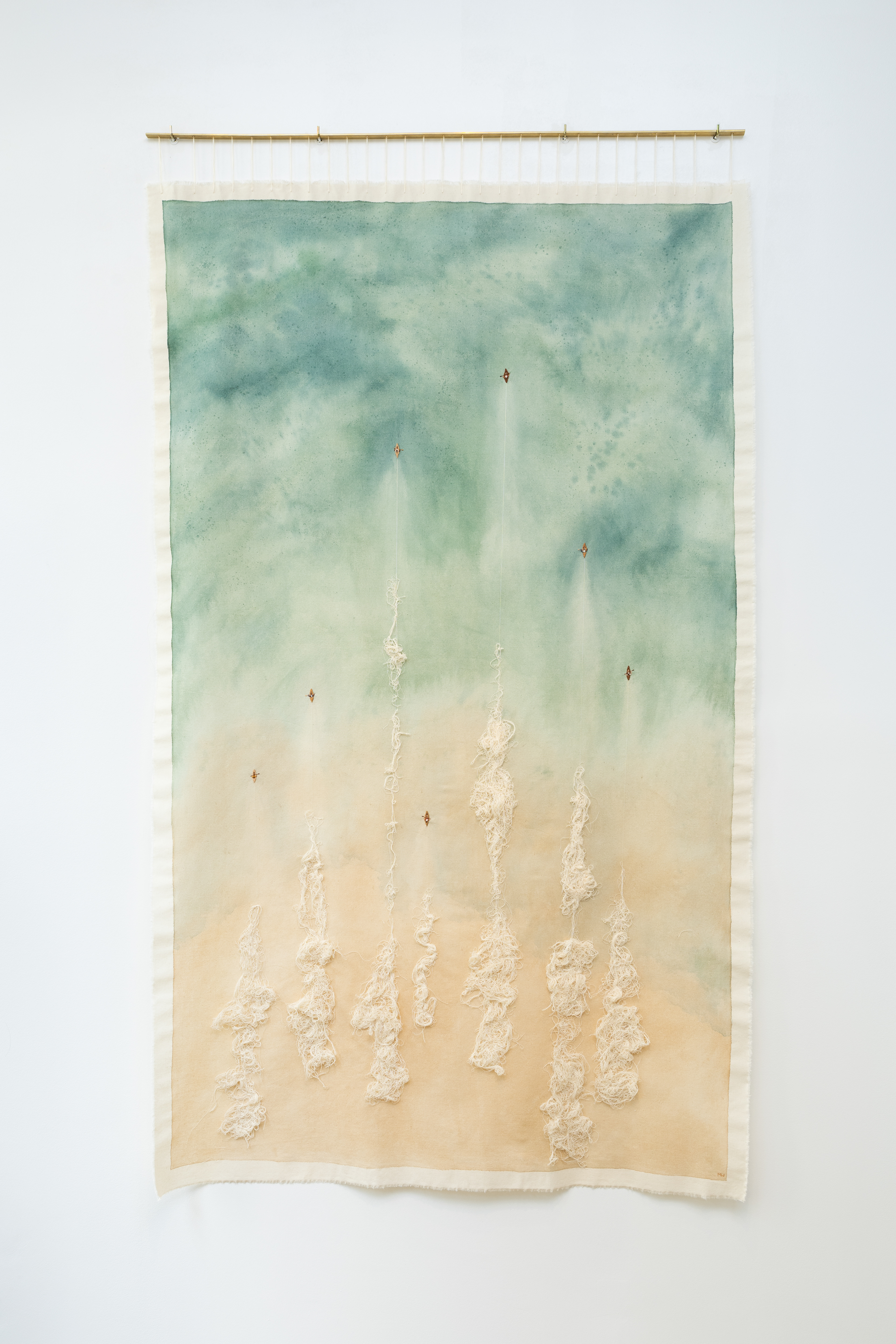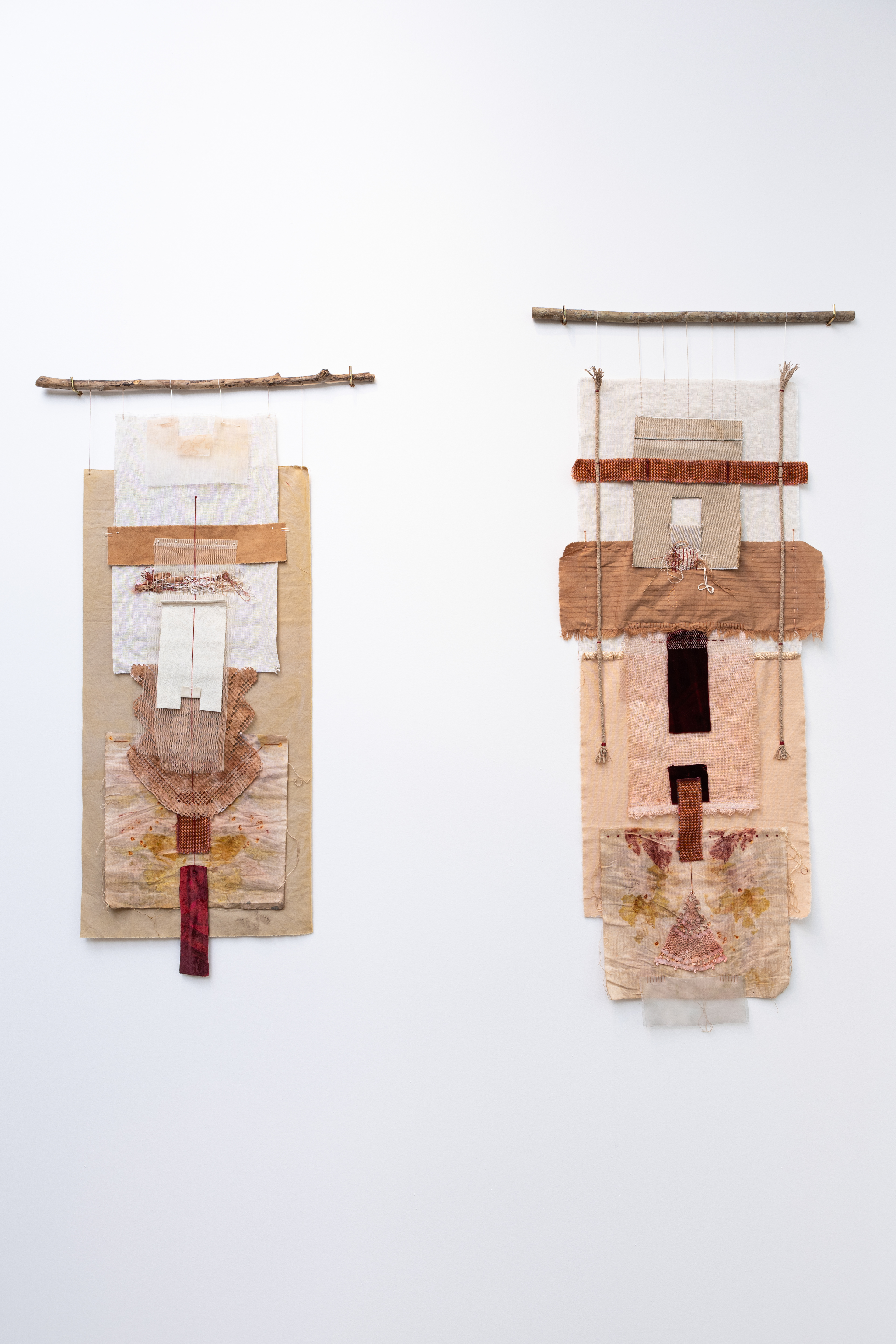 A produção de Mariana Weigand desdobra-se nos campos da arte têxtil, da aquarela e do bordado. Estas linguagens permitem à artista construir obras que ancoram materialmente suas modulações afetivas e imaginação narrativa. Os tecidos operam na poética de Weigand tanto como suporte – espaço de negociação entre a intencionalidade da artista e a fluidez da aquarela –, quanto como fragmentos de histórias sobre as quais a artista nos convida a especular. As obras da série Amarras e a inédita Intersecção corpo memória são representativas da linguagem que a artista vem desenvolvendo na aquarela e de sua polivalência, uma vez que na referida série a pintura torna-se o fundo de uma cena bordada, enquanto na segunda obra ela convive com a linha de forma imanente, em um sistema de camadas e transparências. Nos Relicários e em Amarração, Fissuras e Fusões o tecido adquire protagonismo e se torna elemento compositivo, passando ao primeiro plano. Dois dos Relicários que apresentamos nascem de uma coleção de retalhos carregada de memórias e afetos da própria artista; um terceiro Relicário e as obras Amarração, Fissuras e Fusões têm origem em um vestido de noiva presenteado à artista e por ela decomposto em uma espécie de modelagem às avessas, saturada de simbolismo.